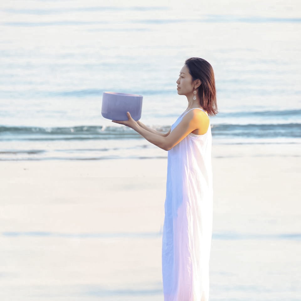 クリスタルボウルを通して、エゴを溶かし純粋な意識へ立ち返る「次元という層を超えた変容」を伝えている。